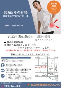 院長から、腰痛の基礎知識と予防についてお話しさせて頂きます。講座は後半で予防となるストレッチや、体操の実技も御体験いただく予定です。