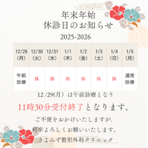 12月29日(月)は午前診療となるため、11時30分受付終了となります。